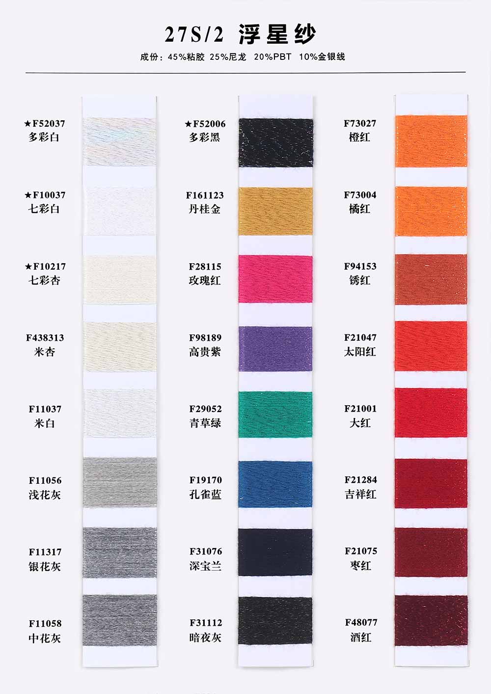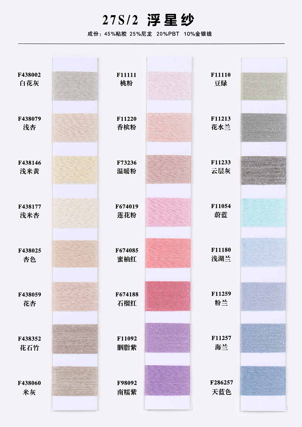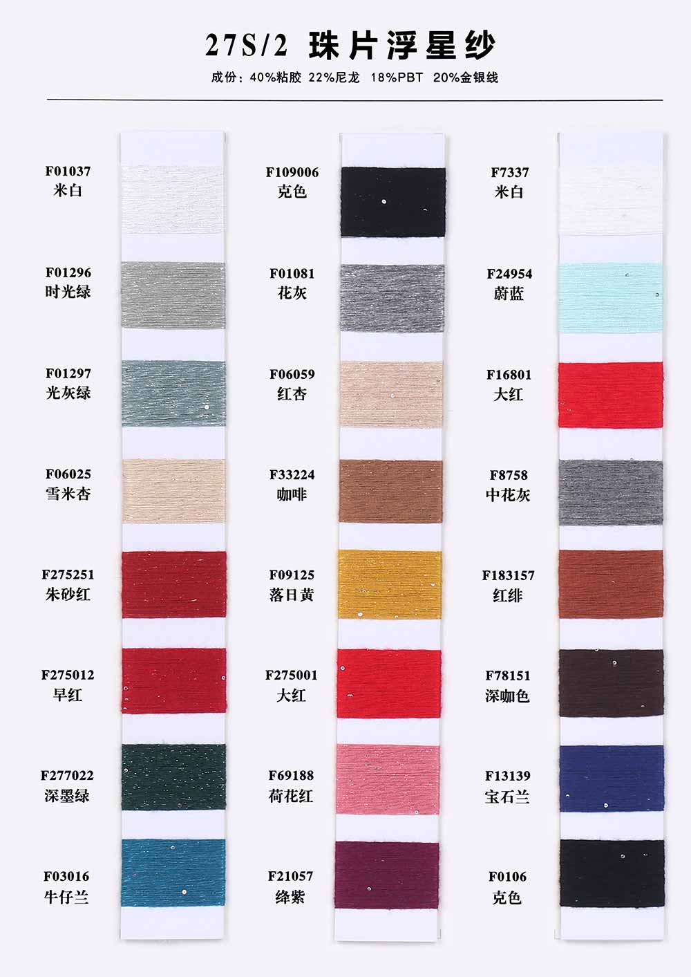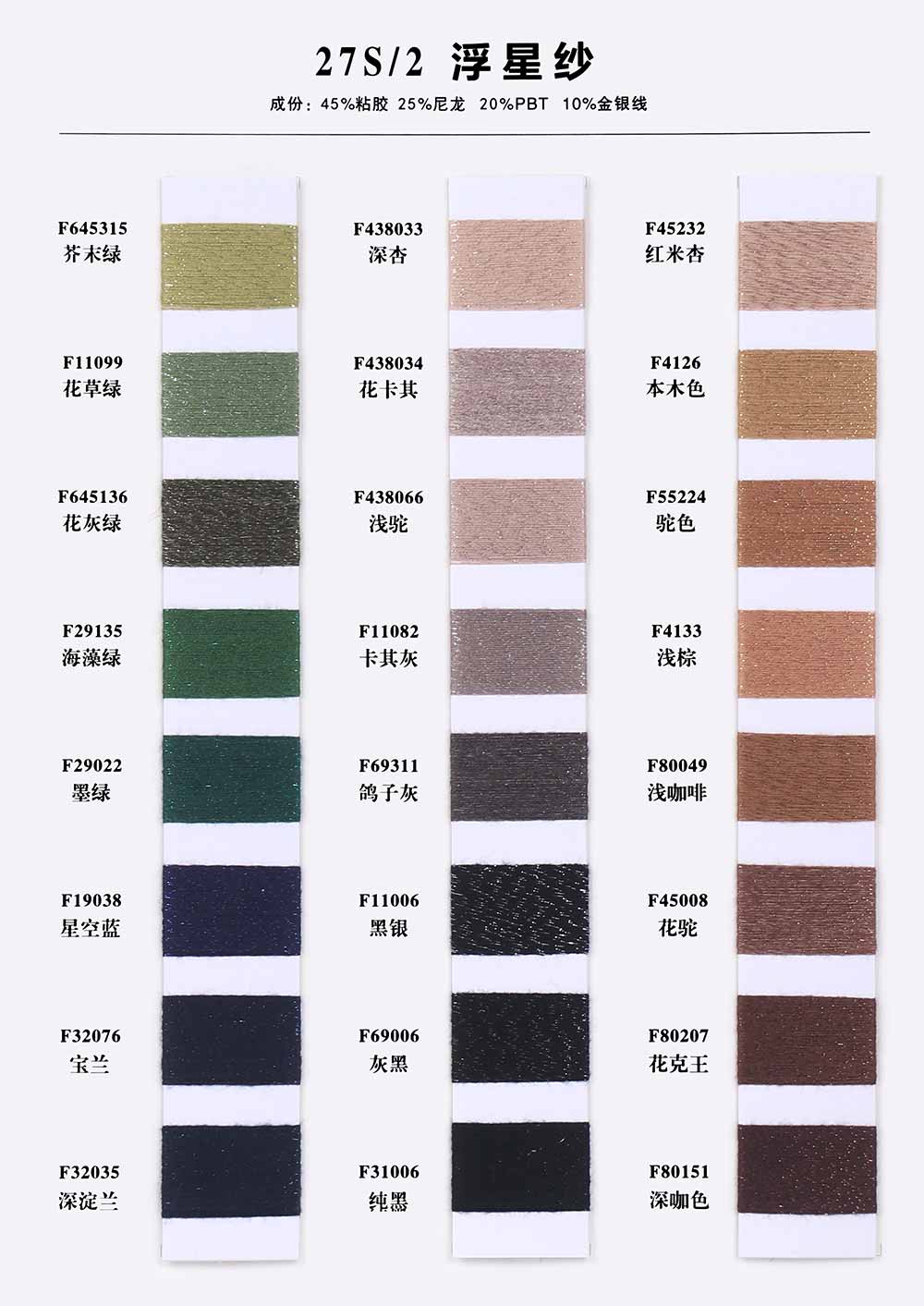 45%粘胶Viscose 25%尼龙Nylon 20%PBT 10%金银线Metallic/40%粘胶Viscose 22%尼龙Nylon 18%PBT 20%金银线Metallic