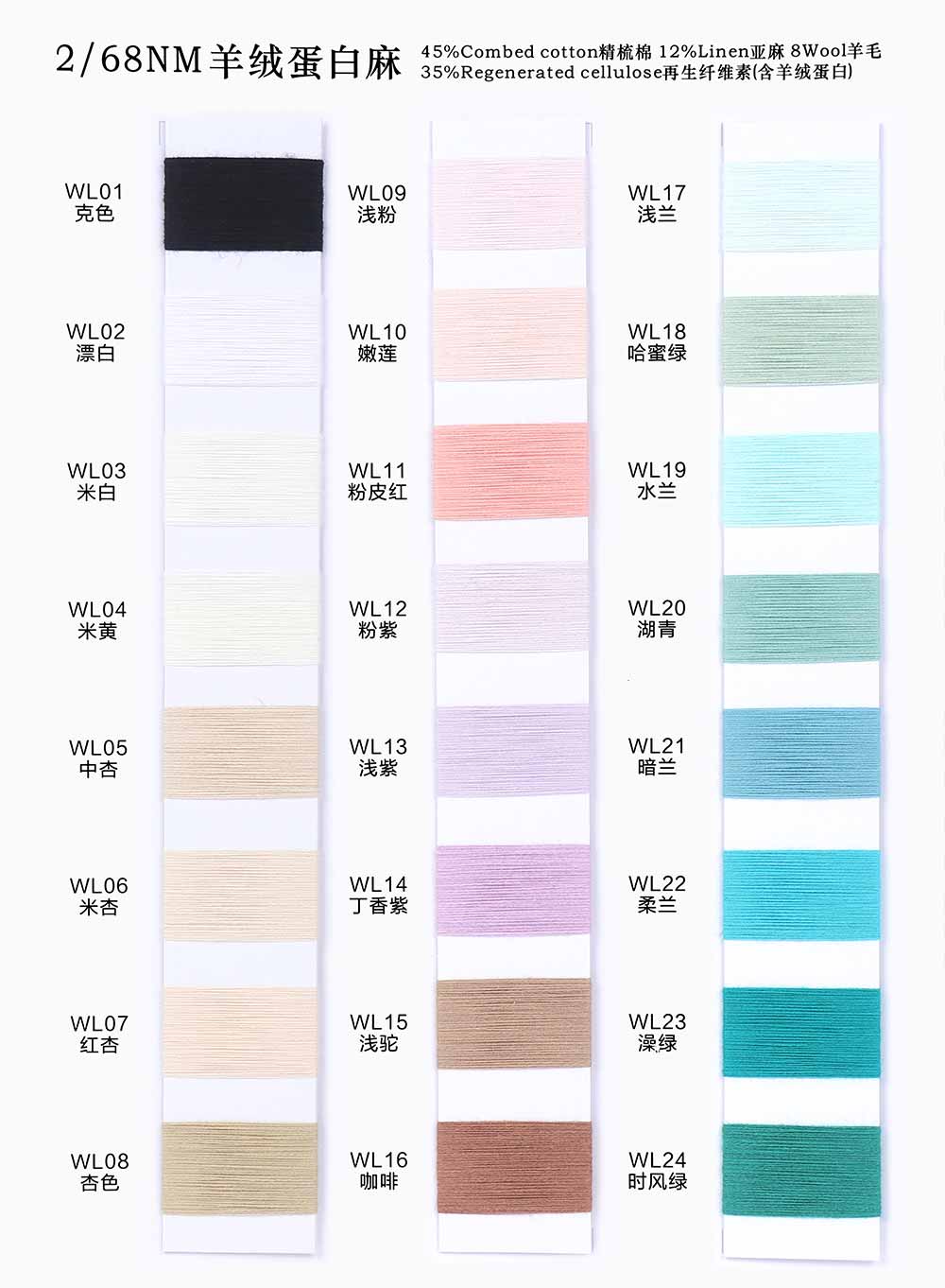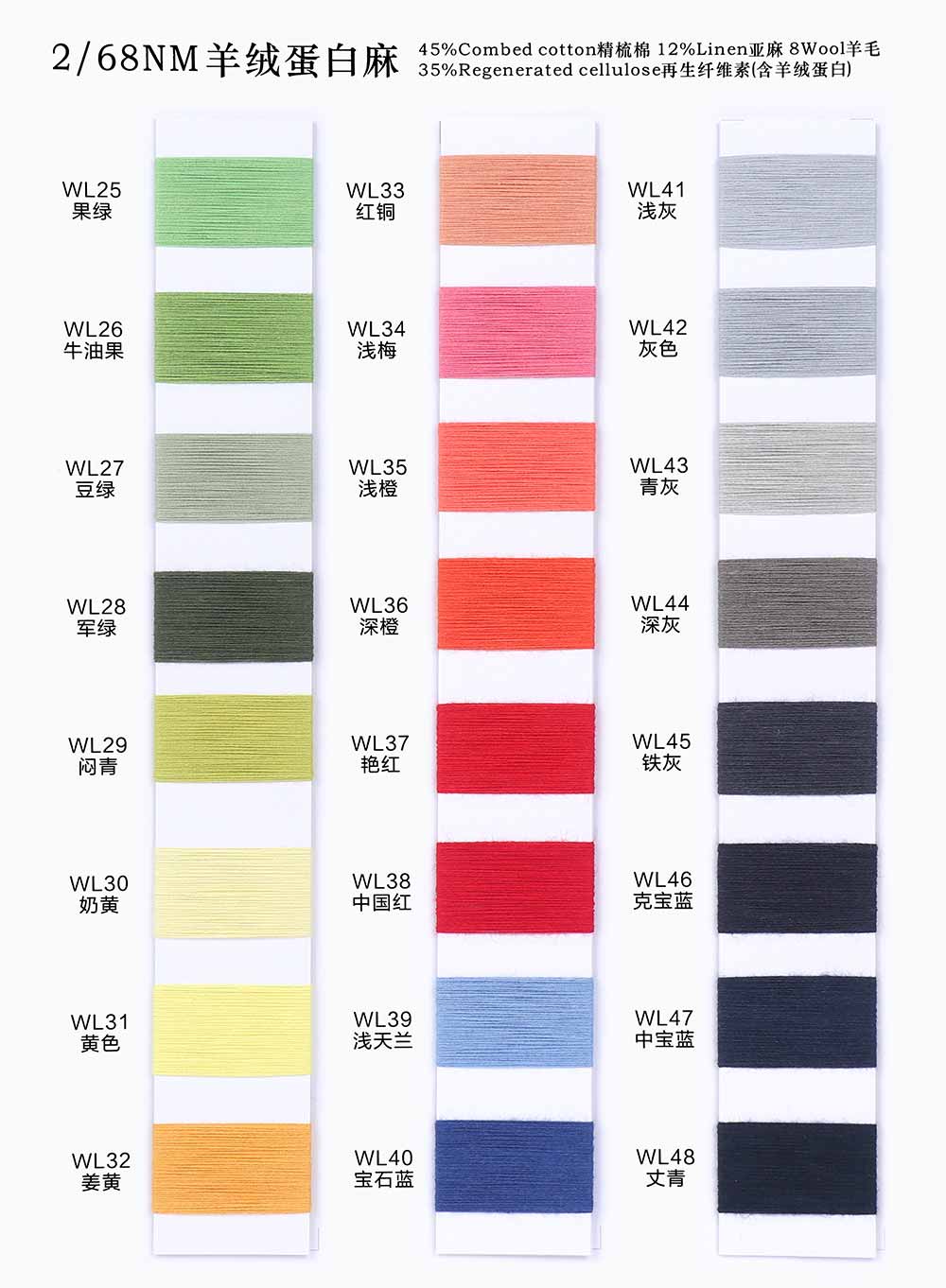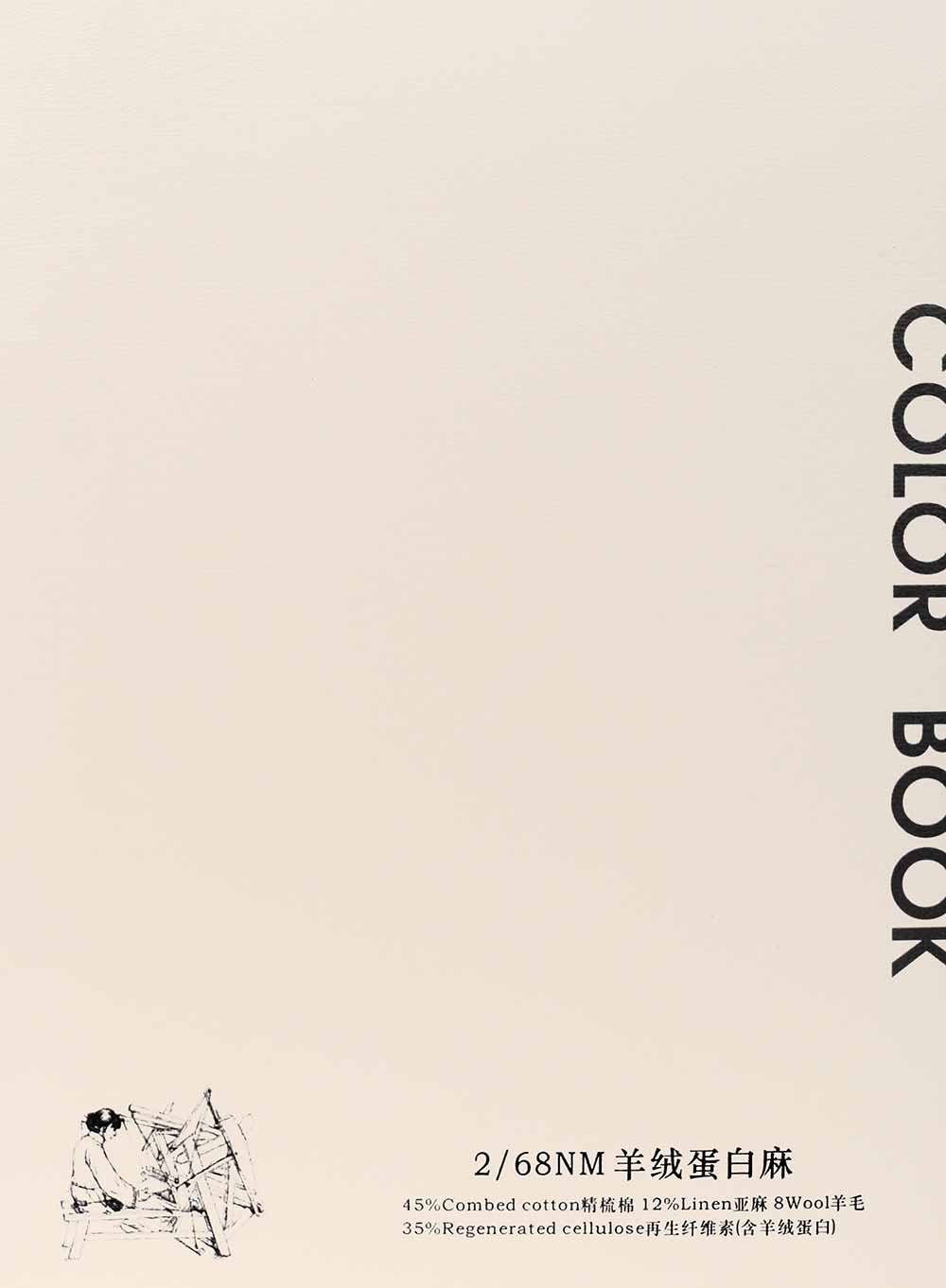 45%精梳棉Combed cotton 12%亚麻Linen 8%羊毛Wool 35%再生纤维素(含羊绒蛋白)Regenerated cellulose