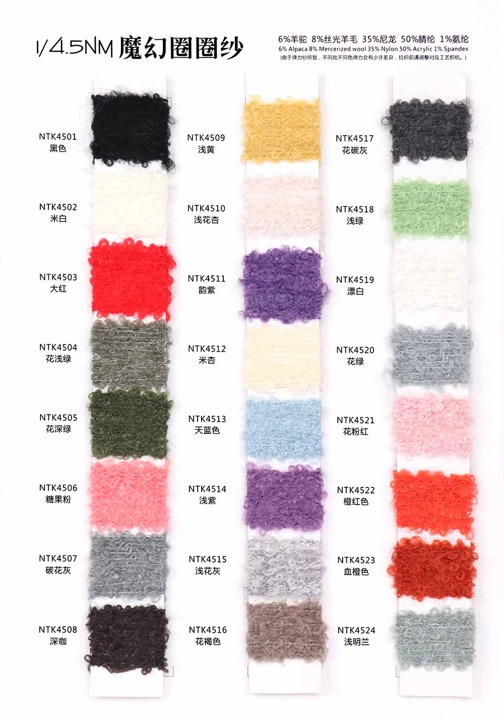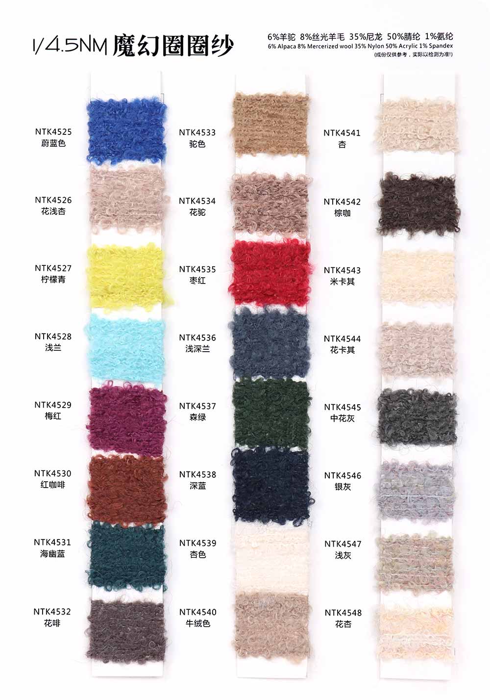 6%羊驼Alpaca 8%丝光羊毛Mercerized wool 35%尼龙Nylon 50%腈纶Acrylic 1%氨纶Spandex